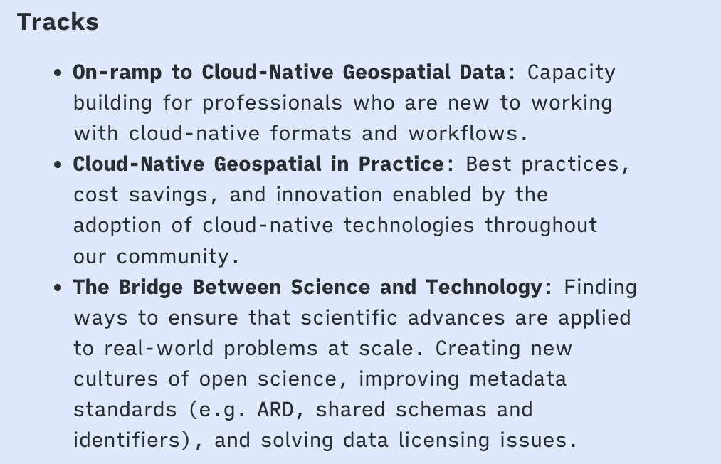 So please, buy your ticket soon and join us! And don’t worry if you’re not already deep in Cloud-Native Geospatial, or even barely know what it is, as a major goal is to help everyone learn. One of the three primary tracks is ‘On-ramp to Cloud-Native Geospatial Data’.