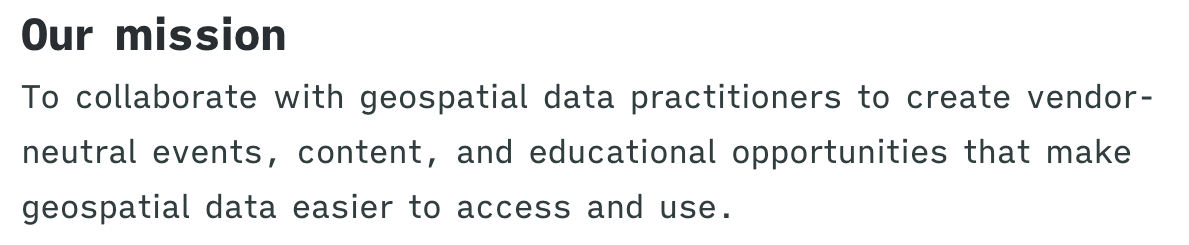 The vision is to make geospatial data easier to access to use, and to grow the resources being invested to make that happen. It’s all under the Radiant Earth non-profit (501(c)3), which means that all revenue from membership and the conference (after covering costs) goes back into strengthening the community, bringing people together more, and fulfilling the vision.