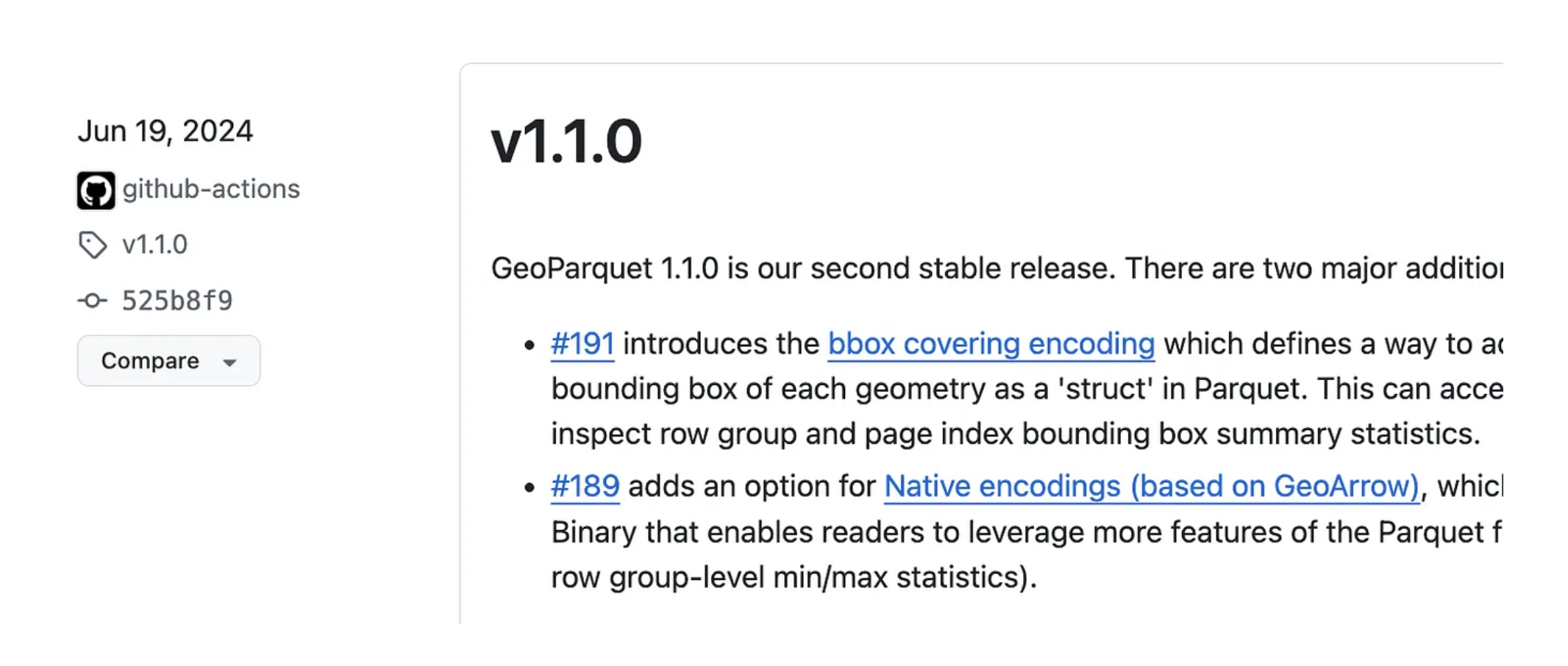 The only thing that I think is ‘off’ in the post is the timeline that says GeoParquet 1.1 was ‘published three months after the introduction of GEOMETRY and GEOGRAPHY in Parquet’. GeoParquet 1.1 was June 19th of 2024, while the geospatial types landed in Parquet core in March of 2025.